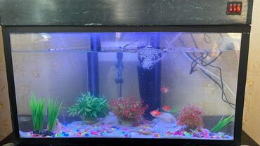 Akvaryum dəsti – bitkilərlə və aksessuarlarla+yem - Şüşə akvaryum, düz bucaqlı forma - Üst hissədə LED işıqlandırma lampası (sərin tonlu, şlanqlı-klipsli dirək) - Daxili filtr və hava verən nasos ...