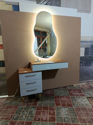 GüzgülüVizaj/komod dəsti – qeyri-standart formalı LED işıqlı güzgü və saxlama bölməli masa