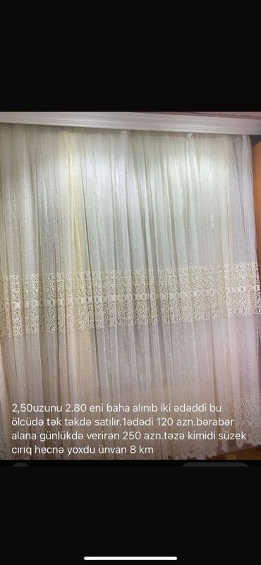 - Tül pərdə dəsti. Uzunluq 2,50 m, en 2,80 m. Eyni ölçüdə 2 ədəd mövcuddur, tək-tək də satılır. Mətn üzərində qeyd: “1 ədəd 120 AZN, birlikdə alan üçün günündə verilir 250 AZN. Süzək, cırıq heç nə yoxdur. Ünvan 8 km.” Ağ-krem rəngli, alt hissəsində bəzəkli naxış zolağı.