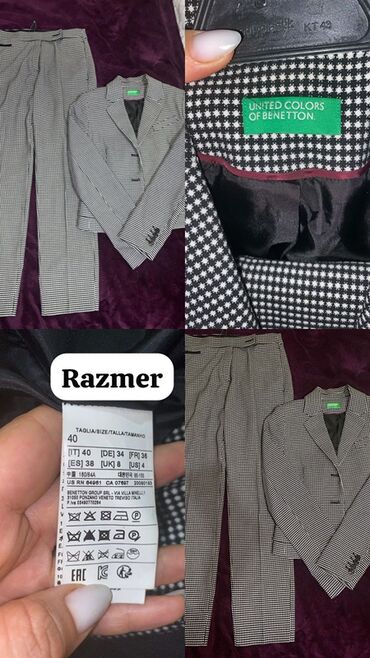 - United Colors of Benetton qadın kostyumu. Xırda haşiyəli (houndstooth) naxışlı parça, astarlı pencək və uyğun şalvar dəsti. Pencəkdə 3 düymə, yaxalıq və ciblər; şalvarda ütü cizgisi, kəmər yuvaları və yan cib. Etiket ölçüsü: IT 40 / DE 34 / FR 36 / ES 38 / UK 8 / US 4. Qulluq nişanları etiketdə göstərilib.