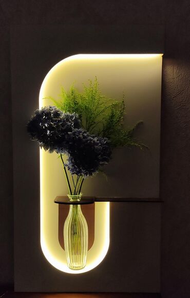 Materiallar: MDF tipli panel, şüşə vaza, LED işıq mənbəyi, metal/taxta rəf hissələri.