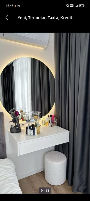 - Güzgü: Böyük dairəvi forma, kənarlardan inteqrə LED işıq; makiyaj və saç düzümü üçün kölgəsiz görünüş.