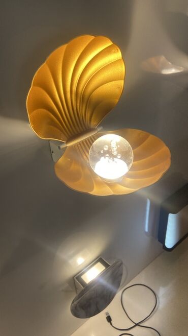 - Dekorativ divar bra: qızılı balıqqulağı formalı reflektor və şüşə kürə lampalı dizayn. Yumşaq, isti işıqlandırma yaradaraq yataq otağı, qonaq otağı və restoran interyerlərinə estetik vurğu qatır.