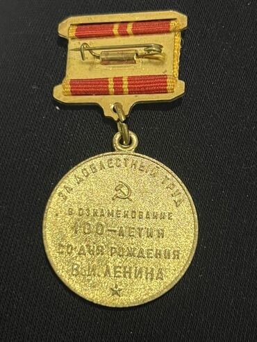 - Arxa tərəfi: rus dilində yazı və oraq-çəkic nişanı. Yazı mətni: “За доблестный труд. В ознаменование 100-летия со дня рождения В. И. Ленина”.