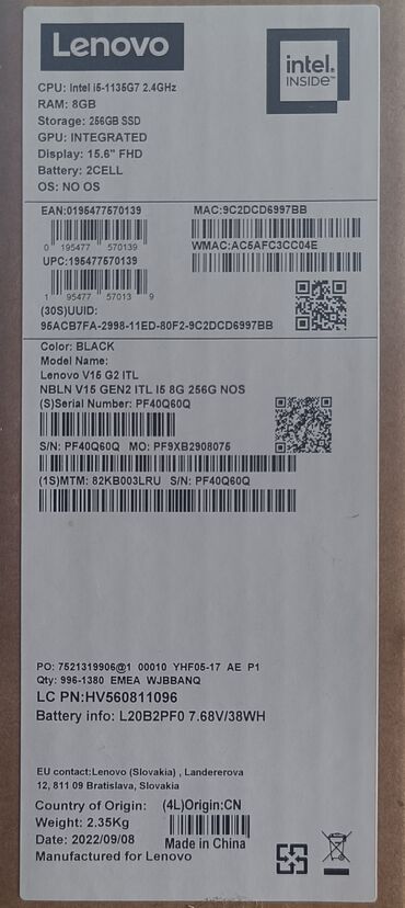 Qutudakı etiketdəki məlumatlar təsdiqlənir: EAN/UPC kodları, seriya nömrəsi PF40Q60Q, istehsal tarixi 2022‑09‑08. İş və təhsil üçün uyğun 15.6” FHD ekran, sürətli SSD və i5 11‑ci nəsil prosessor kombinasiya olunur.
