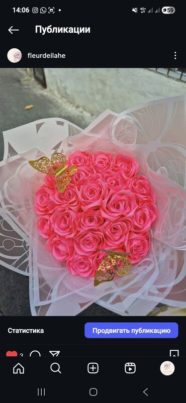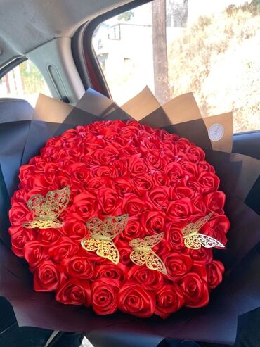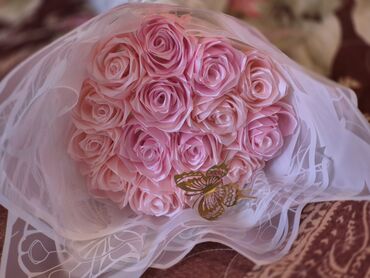Məhsul: Gül dəstəsi - Rəng: açıq-çəhrayı qızılgüllər - Tərtibat: ağ fonlu, qızılı naxışlı bükmə kağızı - Aksessuar: qızılı rəngdə kəpənək bəzəyi - Dəstənin forması: sıx yığılmış, dairəvi kompozisi...