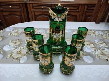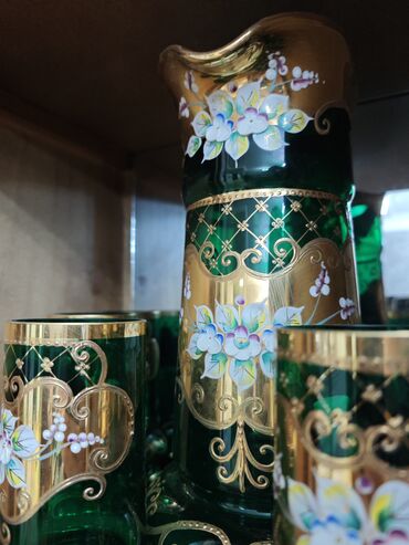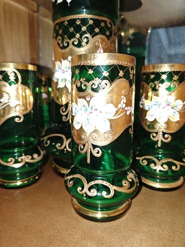 Zərif dizaynlı, qızılı haşiyəli, şəffaf yaşıl rəngli içki dəsti. Dəstə bir ədəd qarafın və altı ədəd stəkan daxildir. Qarafın qapağı da eyni dizaynda işlənib.