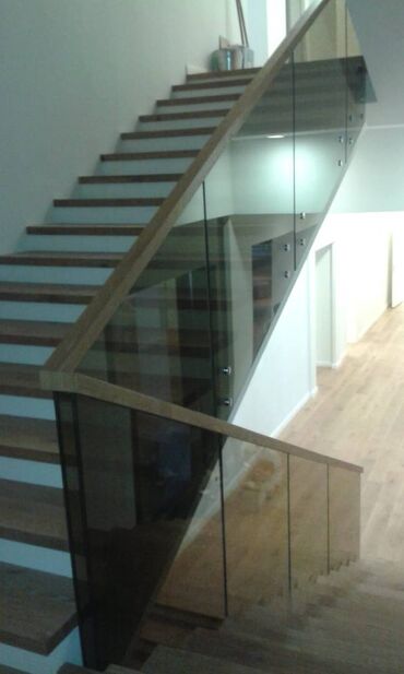 Şüşə panellərdən ibarət müasir pilləkən məhəccəri. Məhəccər pilləkənlərin təhlükəsizliyini təmin edir və hər hansı bir interyerə zəriflik qatır. Məhəccərin şüşə panelləri davamlı və etibarlıdır, hə...