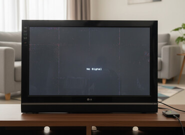 - Ekran: LCD panel, təxminən 32" diaqonal (şəkildən göründüyü qədər), “No Signal” və qar dənəsi ekranı göstərir