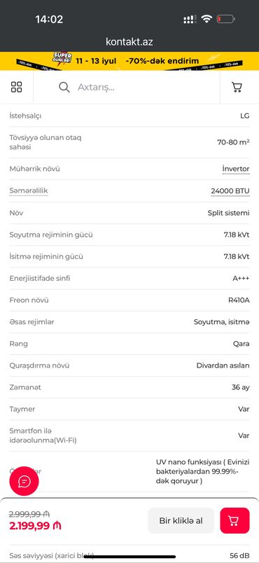 🔥LG A24CMH 24000 BTU DUAL INVERTOR WI-FI QARA RƏNG ZAVOD BAGLİ PAKOFKA YENİDİR PAKOFKA AÇILMAYIB. 1 il resmi zamanet