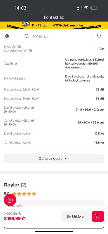 🔸Dual inverter 🔸Tövsiyə edilən otaq sahəsi: 80-85 m2 🔸Rəng: Qara 🔸Enerji sərfiyyatı sinfi: A 🔸Turbo rejim: var 🔸İsitmə rejimin gücü: 7.32 k/vt 🔸İsitmə BTU: 24000 BTU 🔸Soyutma rejimin gücü: 7.18 k/vt 🔸Soyutma BTU: 24000 BTU 🔸Daxili blokun çəkisi: 14.3 kq 🔸Xarici blokun səs səviyyəsi: 57 db 🔸Maksimal hava axını, kub.m/dəq: 21 m3/dəq 🔸Xarici blokun çəkisi: 42.7 kq 🔸Daxili blokun səs səviyyəsi: 55 db 🔸Gecə rejimi: var 🔸Daxili blokun ölçüləri, Hündürlüyü / Eni / Dərinliyi: 34.5 x 99.8 x 21.2 sm 🔸Xarici blokun ölçüləri, Hündürlüyü / Eni / Dərinliyi: 65.5 x 87 x 32 sm 🔸Smart Control: Smart idarə etmə (WI-FI) 🔸Qiyməte catdirilma ve quraşdırma aid deyil ❌... qiymet sondu en ucuz biz satiriq