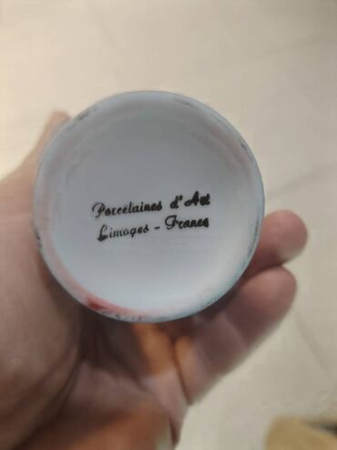 Miniatür farfor vaza-amfora, “Porcelaines d’Art, Limoges – France”. Ağ şirli farfor, təx. 1970–1990-cı illər. Hündürlük təx. 9–11 sm. Vəziyyəti yaxşıdır, görünən çat və ya sınıq yoxdur. Nadir əşya deyil, suvenir limoj istehsalıdır.