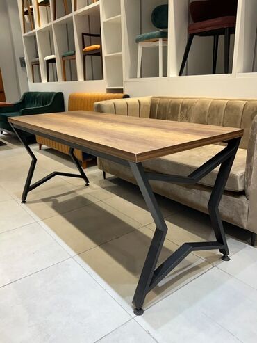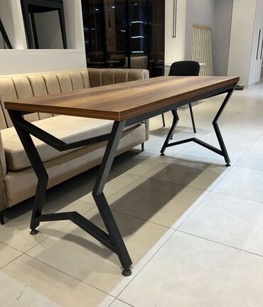 Metal karkaslı mebel məhsulları - İş/oxu masası: Taxta teksturalı üst səth, qalın və möhkəm stolüstü. Qara rəngli metal “Z” formalı ayaqlar sayəsində stabil və modern görünüş. Minimalist interyerl...