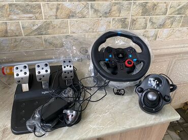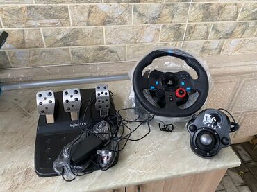 - Logitech G29 sükan (PlayStation simvollu idarəetmə düymələri, D‑pad, LED göstəricilər, döngə tənzimləmə üçün qırmızı dial)