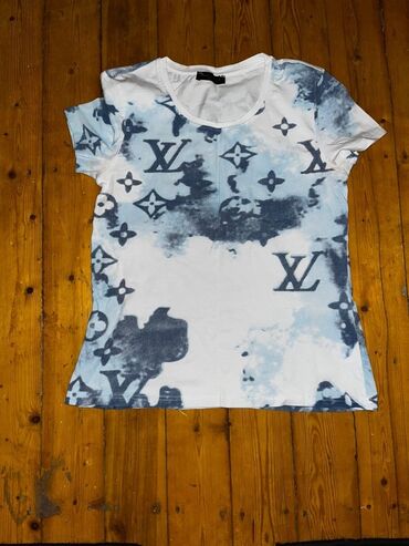 - Rəng/naxış: Ağ fonda mavi‑boz tie‑dye effekti və LV monoqram motivləri (fleur‑de‑lis elementləri, “LV” loqoları)