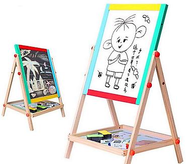 Ölçüləri qeyd olunub. 3+ uşaqlar üçün nəzərdə tutulub. İki tərəfli lövhədir. həm təbaşir, həm də markerlə yazılır. Silgi, marker və təbaşir içində əlavə olaraq verilir.
