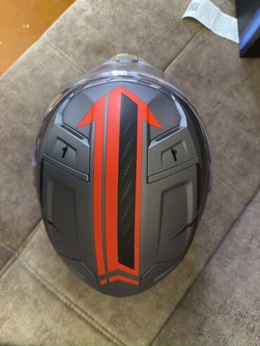 Motosiklet dəbilqəsi – AXK tam üzlü model - Korpus: aerodinamik tam üz örtüklü gövdə, möhkəm kompozit materialdan. - Rənglər: mat qara üzərində qırmızı qrafika və parlaq qara üzərində yaşıl qrafik...