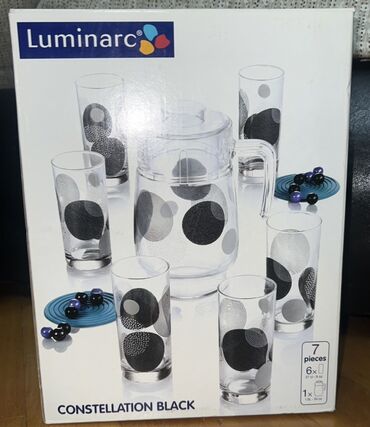 Luminarc firmasının 12 ədəd sok stəkanı və 1 ədəd qrafini. Hamısı birlikdə 35 manata satılır istifadə olunmayıb. Karopkası atılıb şkafa yığılıb deyə ucuz satırıq