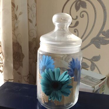- Dizayn: bankaların üzərində mavi çiçək printi; yumru formalı, qalın şüşə gövdə və tutacaqlı qapaq