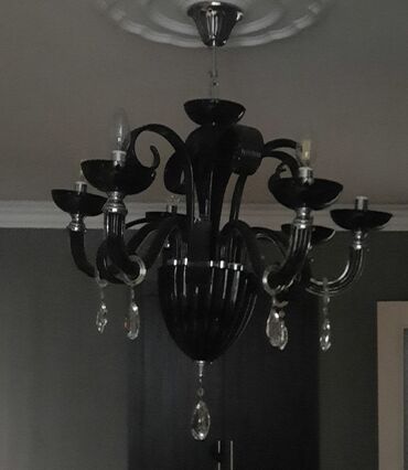 Şüşə-kristal tavan lampası (plasfon) - Forma: dairəvi, yarı-qapalı tavan tipli - Material: parlaq xrom rəngli korpus, kəsimli kristal elementlər və şüşə bəzəklər - Dizayn: ağ fon üzərində qızılı ç...