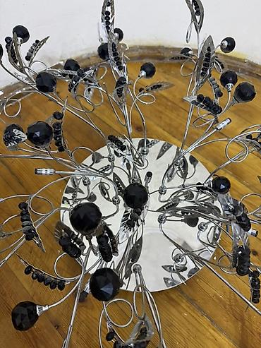 Dekorativ tavan lampası – gümüşü metal korpus, güzgülü əsas və qara kristal bəzəklər