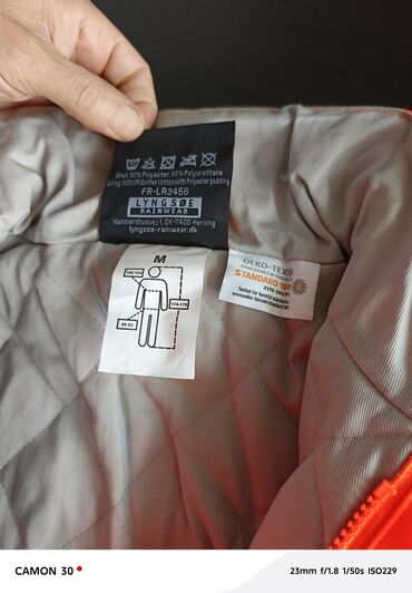 - Geyim üzərində təhlükəsizlik piktogramları (su, mexaniki təsir, alov/istilik, elektrik və s. üzrə qoruma kateqoriyaları işarələnib)
