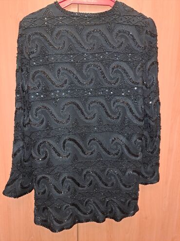 Qara zərif bluz - Rəng: Qara - Parça: İncə şəbəkə/til parça, xırda parıltı detallar ilə - Dizayn: Dairəvi yaxa, 3/4 uzunluqda şəffaf qollar - Aşağı hissə: Ornamenti olan krujeva (qıpqara) ətək kən...