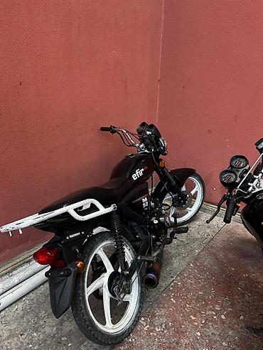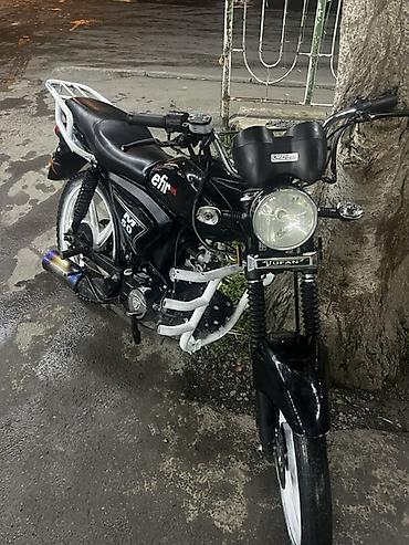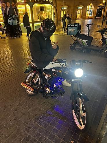 Moped/motosiklet – Efir M50 - Mühərrik: 50cc, 4 takt (üzərində “M50” işarəsi) - Rəng: qara, ağ qoruyucu crash-bar və arxa daşıyıcı ilə - Yürüş üçün uyğun şəhər tipi dizayn, yüngül kuzov - Ön dairə...