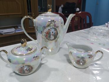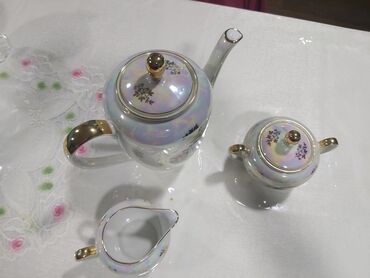 Porcelain çay dəsti - Klassik dizaynlı bənövşəyi-şampan rəng palitrası, qızılı detallar - Naqişli ornamentlər və mərkəzdə floral medalyon motivləri - Komplektə daxildir: - 1 ədəd çaydan (qapaqlı...