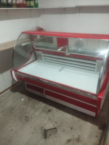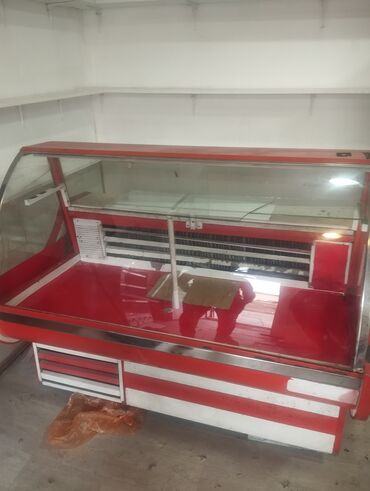 - Soyutma vitrinləri (2 ədəd): Qırmızı-ağ korpus, ön və üst şüşə vitrin, daxilində məhsul yerləşdirmək üçün geniş iş səthi. Aşağı hissədə ventilyasiya barmaqlıqları və servis bölməsi. Ət, süd məhsulları, şirniyyat və hazır yeməklərin vitrində soyudularaq sərgilənməsi üçün uyğundur.