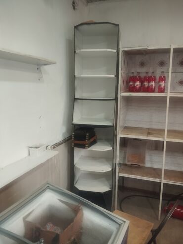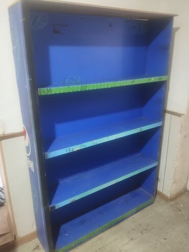- Metal/taxta mağaza rəfi (böyük): Pepsi temalı yan panellər, 4 geniş polka, dərin gövdə. İç və arxa hissə mavi rəngdədir, polkalar üzərində ölçü nişanları var. İçki, qida, qeyri-qida məhsullarının düzümü üçün.