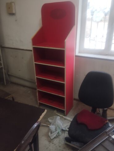 - Taxta promo/ekspozisiya stendi (kiçik): Qırmızı rəng, 4 polkalı, üst hissəsi başlıq lövhəsi ilə. Kassaya yaxın impuls məhsullar, qəlyanaltı və aksessuarların sərgilənməsi üçün əlverişlidir.