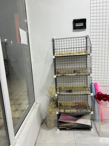 - Qara metal səbətli stend: bir neçə mərtəbəli, hər mərtəbədə qəfəs tipli səbətlər. Jurnal, bükmə kağızı, aksesuar və yüngül məhsullar üçün rahat vitrindir.