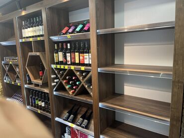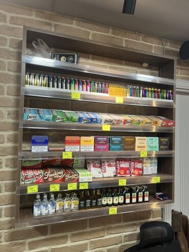 - Divar vitrinləri: çoxsəviyyəli açıq rəf sistemi, hər rəfdə ön qoruyucu şəffaf bordür/profil; diş məcunları, aksessuarlar, alkoqollu və alkoqolsuz içkilər, tütün aksessuarları və xırda malların sərgilənməsi üçün