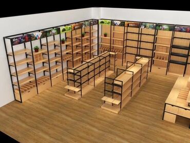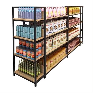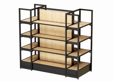 Mağaza üçün metal karkaslı rəf sistemi - Dizayn: Qara rəngli, möhkəm metal karkas + ağac teksturalı laminat rəf taxtaları. İkiüzlü konstruksiya, hər iki tərəfdən vitrinləmə imkanı. - Modul quruluş...