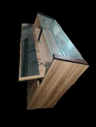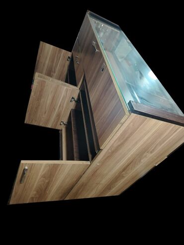 - Material: ağac teksturalı laminat (MDF/LDSP tipli), üst hissə bütöv şüşə vitrinlə.