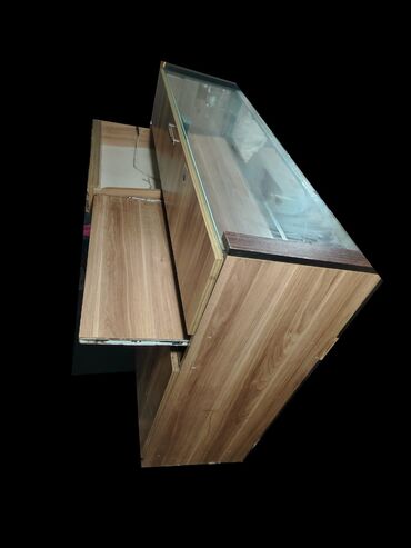 Şüşə vitrinli vitrindən ibarət mağaza stendi - Material: ağac teksturalı laminat korpus, yuxarı hissə qalın temperli şüşə vitrin. - Üst hissə: iki bölməli nümayiş vitrini, şüşə qapaq, içəridə vitr...