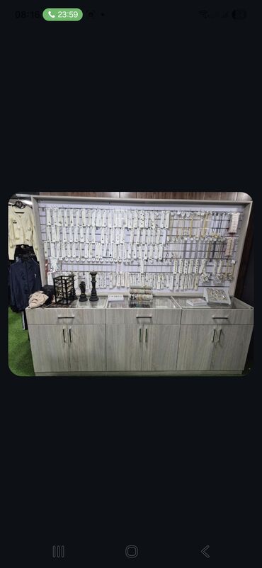 - Arxa divarda metal relsli, qarmaqlı panel – sırğa, bilərzik, boyunbağı, saat, brelok və s. asqı ilə nümayiş üçündür