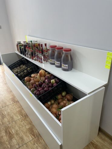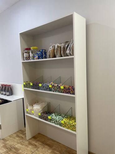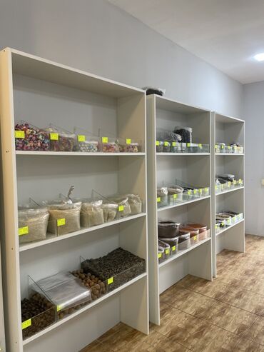 - 3 ədəd ağ rəngli düzbucaqlı vitrin rəf (hündür, çoxsəviyyəli). Hər rəfdə şəffaf akril bölmələr: konfeti, quru məhsul, paxla, düyü, ədviyyat və s. üçün uyğun.