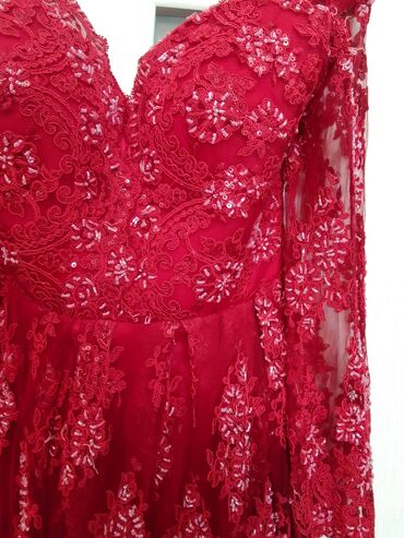 Qırmızı gecə/libas - Rəng: dərin qırmızı (şərab tonu) - Model: Uzun, axıcı tüll ətəkli geyim - Üst hissə: şəffaf tüll üzərində zəngin applike və muncuq/daş bəzəkləri, çiçək motivləri - Yaxa: dərin...