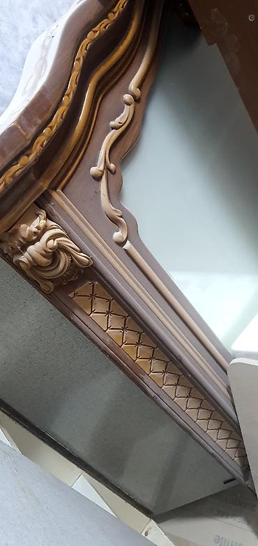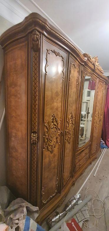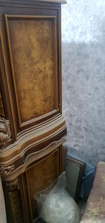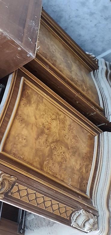 Yataq otağı dəsti Tərkib: - İki nəfərlik çarpayı: Yüksək, parça başlıq (bənövşəyi rəng, düyməli dekor), başlıqda inteqrə edilmiş rəflər. Hündür ayaqlı konstruksiya. - İki ədəd tumbə: Ağ və tünd şa...