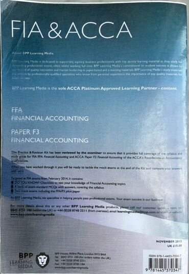 FIA & ACCA F3 Maliyyə Uçotu kursu üçün nəzərdə tutulmuş bu təcrübə və təftiş dəsti, imtahanlara hazırlıq üçün əhatəli material təqdim edir. BPP Learning Media tərəfindən nəşr olunan bu dəst, 2014-cü ilin fevral ayından etibarən keçiriləcək imtahanlar üçün uyğundur. Kitab, mövzuların əhatəli şəkildə öyrənilməsinə kömək edən suallar və cavablar, eləcə də sınaq imtahanları ilə təcrübə imkanı yaradır. Bu dəst, imtahan proqramına tam uyğunluğu təmin etmək üçün tərtib edilmişdir və öyrənmə prosesini dəstəkləyən etibarlı bir mənbədir.