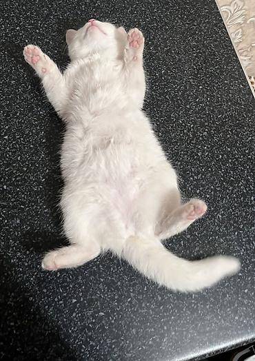 Ağ tüklü, mavi gözlü balaca pişik balası. - Yaş: təxminən balalıq dövrü (kiçik ölçü) - Rəng: tam ağ - Göz rəngi: açıq mavi - Xüsusiyyətlər: zərif quruluşlu, ayıq və oynaq; pəncərə kənarında sakit o...