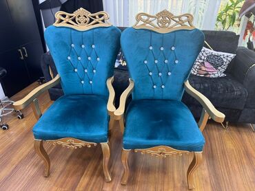 - Dəstə 2 ədəd dekorativ klassik kreslo daxildir: mavi məxmər oturacaq və arxalıq, arxada düyməli kapitone tikiş detalı, qızılı rəngli ağac karkas, oyma bəzəklər və qollu dizayn.