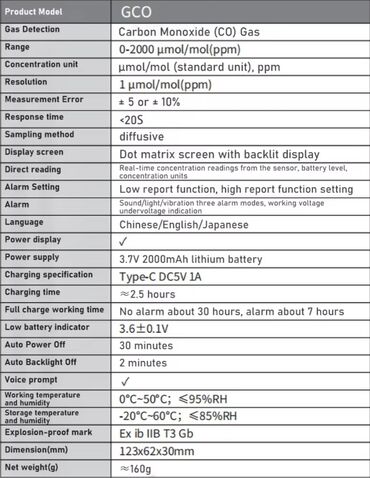 -Daxili 2000mAh litium batareyası ilə batareyanın dəyişdirilməsinə ehtiyac olmadan uzunmüddətli əməliyyat təklif edir. Detektor yüksək və aşağı siqnalizasiya funksiyalarına malikdir ki, bu da fərdləri təhlükəli əraziləri evakuasiya etmək üçün tez xəbərdar etmək üçün səsli siqnalları, qırmızı işıqları və vibrasiyaları işə salır.
