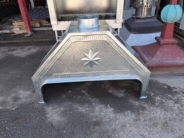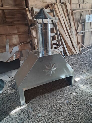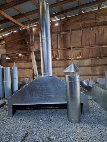 Metaldan istehsal olunan mangal və tüstü toplayıcı başlıqlar - Material: qalınlığı uyğunlaşdırılmış sinklənmiş və boyalı metal - Mangal: üstündə geniş tüstü toplayan başlıq və baca çıxışı, taxta/o...