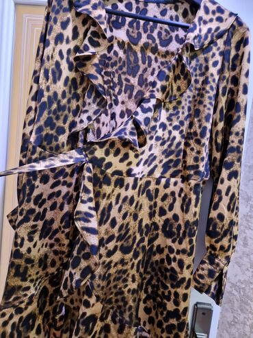 Leopard naxışlı Maxi Geyim - Model: bədənə oturan, uzun, yırtmaclı maxi don - Parça: elastik, axıcı material; leopard print - Dizayn: - Döş hissəsində və sinə boyunca iri volan detalları - Şə...