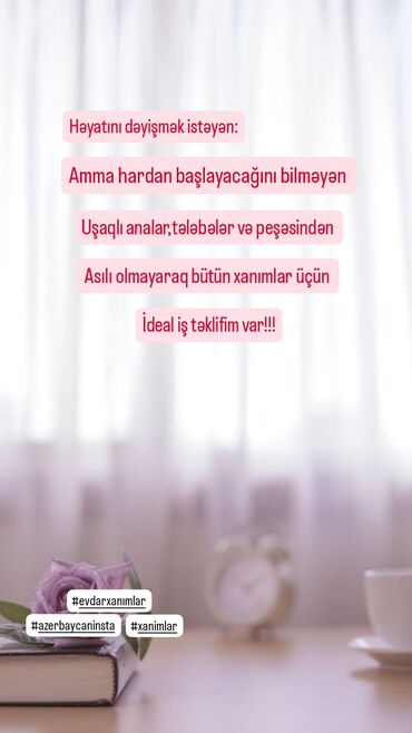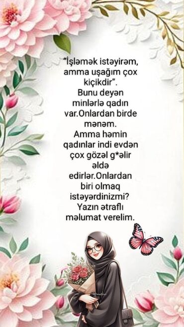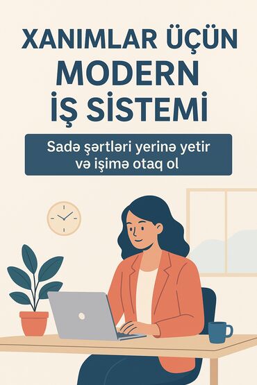 Evdən idarə olunan modern iş sistemi təklif olunur. Uşaqlı analar, tələbələr və peşəsindən asılı olmayaraq bütün xanımlar üçün uyğundur. Sadə şərtlər, çevik qrafik və rəqəmsal alətlərlə işləmə imkanı verilir. Kompüter/telefon və internet kifayətdir. Sistemli öyrədici materiallar və addım-addım dəstək təqdim olunur.