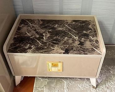 - Tumba (iki ədəd): 46.8 x 45 x 40 – qızılı tutacaqlı çekmecə və üst səthdə gecə lampası/aksesuarlar üçün yer.