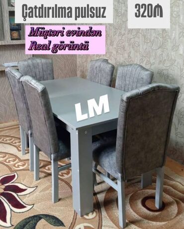 Masa 6 Stul dəsti Masa bağlı: 90×1.70+6stul: 320₼ Masa açılan : 90x1.60x2+6stul: 370₼ oturacaq böyük ölçü eni : 47sm📌 6 stul masasız : 230 ₼ tək stul : 40₼ Təhvil: 5/6 günə ✔️ Çatdırılma...